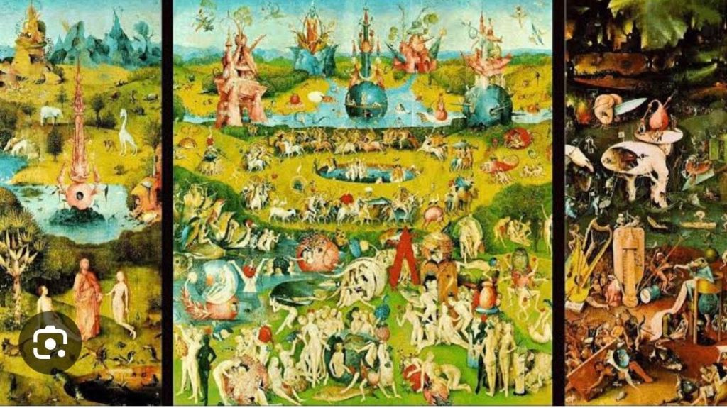 La obra se llama “El jardín de las delicias”, es de El Bosco, un español de la Edad Media. Hoy en día, se encuentra ubicado en el Museo del Prado, segundo piso, primer pasillo al fondo, sala A . Ahí yace el tríptico de la humanidad, la obra que quiero salvar.